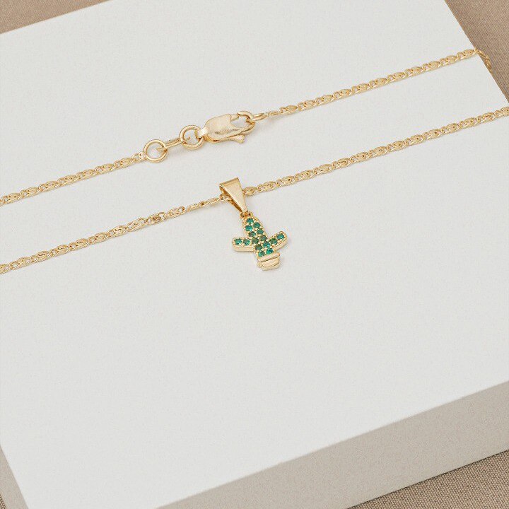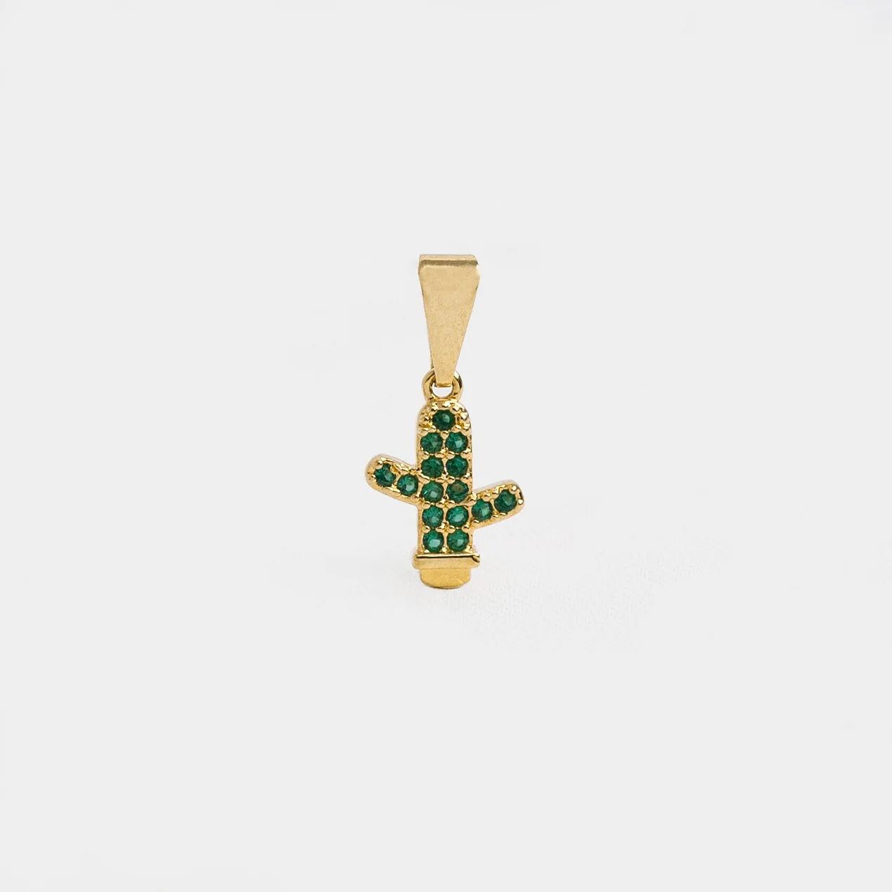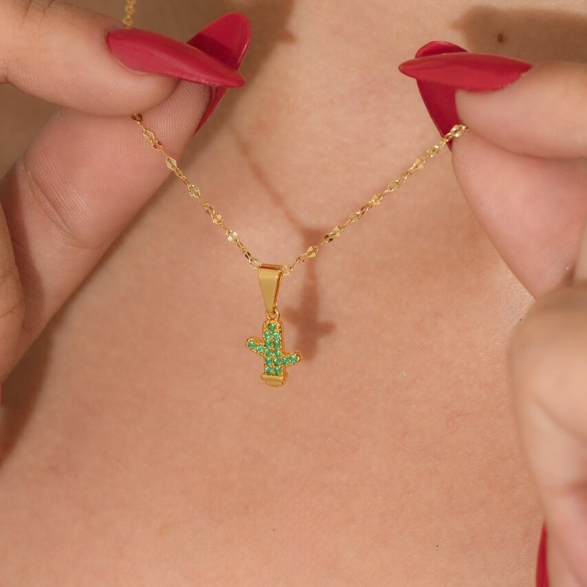 Un dije en oro laminado 18K inspirado en la silueta del cactus, símbolo de resistencia, vitalidad y energía positiva.