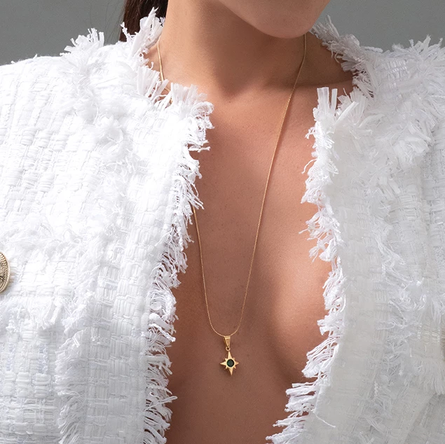 Este elegante dije en oro laminado 18K luce una circonia central que resplandece como la luz de una estrella, aportando distinción y un toque mágico a cualquier estilo.