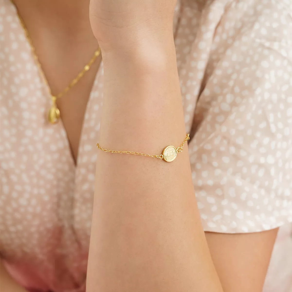 Elaborada en oro laminado 18K, su diseño delicado con la imagen de la Virgen Guadalupe transmite protección, espiritualidad y elegancia en cada detalle.